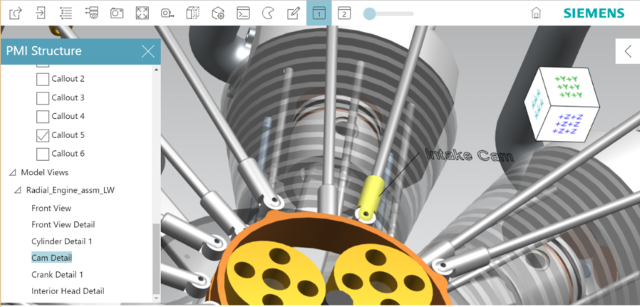 PLM Vis 能够对数字化原型进行导航、分析和标注。导航功能包括探索、检查和纵观,以及旋转、平移、适合和缩放等基本功能。此软件开发套件具备用于剖切、间隙和表面分析的工具。标注支持包括标注文本、2D 几何形状、标注、符号、图片以及 2D/3D PMI 注释。
