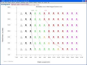 这是SORPAS®自动生成的焊缝生长曲线,用于点焊2 mm至15 kA范围内的1 mm低碳钢板。该软件会自动识别工作范围,其中绿色点表示焊点良好,红色点表示飞溅,黑色点表示无焊接。 |