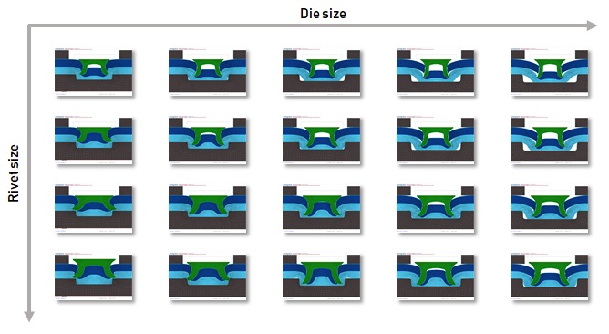 为了获得更佳的接头质量,铆钉的形状和材料、模具设计和材料以及工具力应适当优化。SPR接头的质量可以通过关键的接头因素进行评估,例如联锁长度(铆钉张开),底板的最小厚度,铆钉头的高度以及底板中铆钉的有效长度。