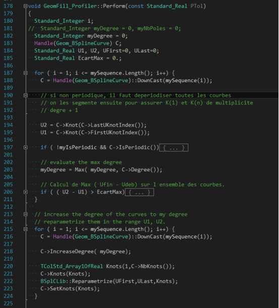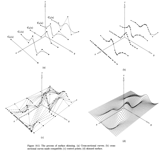 曲面构造-蒙皮曲面eryar2年前更新关注私信4.4W+1.6W+ 蒙面Skinning就是将一簇截面曲线融合在一起生成曲面的过程,截面曲线可以是三维曲线。截面曲线的参数方向为u方向,融合的方向是v方向。蒙面Skinned Surface只是放样(lofting)的新叫法,后者可以追溯到数十年之前计算机尚未诞生的时代。从那时到现在它一直在造船、汽车、和航空工业中被广泛地应用。其中最早的包含放样程序的计算机系统是由英国航空公司的A. Ball开发的CONSURF飞机设计系统。此系统基于有理三次曲线。Filip和T. Ball描述了一种对任意参数截面曲线进行放样的方法。 基于B样条曲线,蒙面的构造过程如下。假设所有的截面曲线定义在相同的节点矢量U上,并具有共同的次数degree。如果这些假设不成立,则通过升次和合并节点矢量的方式来满足假设条件。《The NURBS Book》中给出蒙面的过程图示: 通过对截面曲线进行相容性处理(升阶及节点细化)使截面曲线的次数及节点矢量相同,升阶的时候会重新计算曲线新的控制顶点。使截面曲线相容会使u方向的控制顶点个数增加。尽管蒙面算法原理简单,但要实现一个健壮且易用的蒙皮功能却不容易。另外交互设计蒙皮曲面是一个非常烦琐的迭代过程。曲面形状难以控制。它依赖于截面曲线的数量、形状和位置。设计过程一般是:先从较少数量的截面曲面开始生成蒙皮曲面,用平面去截所得曲面以获得另外的截面曲线,修改新的截面曲线以得到更理想的形状,再重新蒙皮,如此反复迭代。最后得到的曲面仍可能存在不想要的自相交和扭曲。尽管存在这些困难,蒙皮法仍不失为一种强大的并得到广泛应用的曲面设计技术。 OpenCASCADE中蒙皮算法使用类GeomFill_Generator,如图所示为类的注释及相关接口函数: 从类的注释可以看出,使用蒙皮算法要求所有的截面曲线有相同的次数,节点矢量及相同的控制顶点数量。类的使用也很简单,通过函数AddCurve()来设置截面曲线,通过函数Perform()生成蒙皮曲面。其中节点相容处理在基类GeomFill_Profiler的Perform()函数中。 通过遍历所有的截面曲线,得到次数的最大值,将所有曲线使用函数IncreaseDegree()统一升阶到最大次数。并通过合并节点矢量,使所有截面曲线节点矢量相同。除了对普通的截面曲线蒙皮,还可以对闭合的截面曲线进行蒙皮,如下图所示为对圆和椭圆进行蒙皮: 综上所述,对于只有两个截面曲线的蒙皮可以得到直纹面,即直纹面是蒙皮的一个特例。蒙皮只能插值一个方向上的曲线,若有两个方向上的截面曲线,则需要使用Coons或Gordon曲面,当然蒙皮是它们的基础。 © 版权声明文章版权归作者所有,未经允许请勿转载。THE ENDOCC源码学习几何造型器# opencascade code study 喜欢就支持一下吧点赞1.6W+ 分享QQ空间微博QQ好友海报分享复制链接收藏
