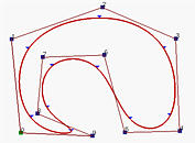 如果节点向量没有任何特别的结构,那么产生的曲线不会与控制折线(polyline)的第一边(leg)和最后一边(leg)接触,如下面左图所示。这种类型的B-样条曲线称为开(open )B-样条曲线。 我们可能想强制曲线使得它分别与第一个控制点和最后一个控制点的第一边和最后一边相切,像贝塞尔曲线那样。为了做到这些,第一个节点和最后一个节点必须是重复度为p+1。这就产生了所谓的clamped B-样条曲线。参见下边中间的图。通过重复某些节点和控制点,产生的曲线会是 闭(closed)曲线。 这种情况,产生的曲线的开始和结尾连接在一起形成了一个闭环如下边右图所示。在本文中,我们将使用clamped曲线。