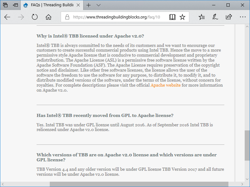 最近从TBB官网了解到,TBB的授权License从GPL改为Apache V2.0,如下图所示: